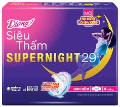 Loại Băng vệ sinh ban đêm Hình thức Có cánh Kích thước 29cm Số lượng: 4 miếng Diana Siêu Thấm Super Night với 4 lần bảo vệ 1. Hệ thống vách chống tràn co giãn Active Standing Gather, chủ động nâng lên ôm khít cơ thể, ngăn chất lỏng tràn sang hai bên, an toàn trong mọi xoay chuyển. 2. Chống tràn sau ưu việt với phần cánh mở rộng ấn tượng đến 16cm cùng hệ thống rãnh thông minh cố định miếng băng. 3. Công nghệ lõi thấm hút Double High Speed đột phá, thấm hút siêu nhanh và khóa chặt chất lỏng tức thì cho bề mặt khô thoáng vượt trội. 4. Bề mặt lưới lụa hóa mềm mại mang đến cảm giác êm dịu luôn khô thoáng cho da.