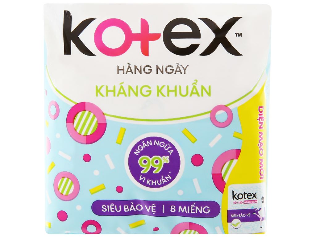 Kotex là thương hiệu với sản phẩm băng vệ sinh giúp chăm sóc vệ sinh phụ nữ nổi tiếng tại Hoa Kỳ. Băng vệ sinh hàng ngày Kotex siêu mềm siêu bảo vệ 8 miếng với mặt bông mềm mại cùng rãnh thấm an toàn, và rãnh bảo vệ khéo kín, giúp bạn luôn tự tin, thoải mái trong những ngày ấy.