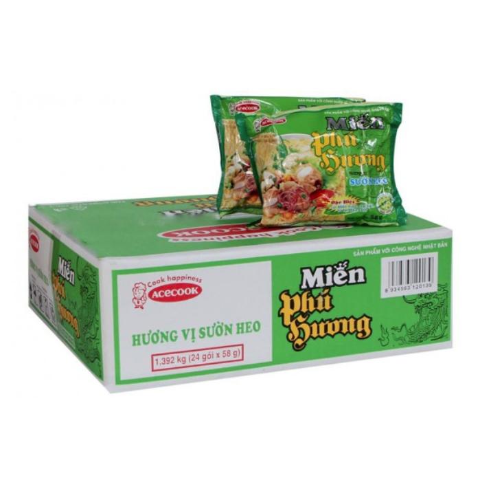 Miến Phú Hương vị Sườn heo là một sản phẩm của Acecook, được sản xuất trên dây chuyền hiện đại với hương vị thơm ngon đậm đà theo khẩu vị ưa thích của người Việt. Sợi miến Sợi nhỏ, màu trắng Khối lượng 58g / gói Thành phần Tinh bột khoai tây, tinh bột đậu hà lan, tinh bột đậu xanh, dầu tinh luyện, muối, đường, chất điều vị, giả thịt (đậu nành), hành, tiêu, ngò, ớt, chả heo sấy, nấm mèo sấy, bột thịt heo, chiết xuất từ thịt dê... Cách nấu Cho vắt miến, các gói gia vị vào tô. Thêm khoảng 400ml nước sôi, đậy nắp trong 3 phút Bảo quản Nơi khô ráo, thoáng mát, tránh ánh nắng mặt trời Thương hiệu Phú Hương (Việt Nam) Sản xuất tại Việt Nam HSD: 6 tháng