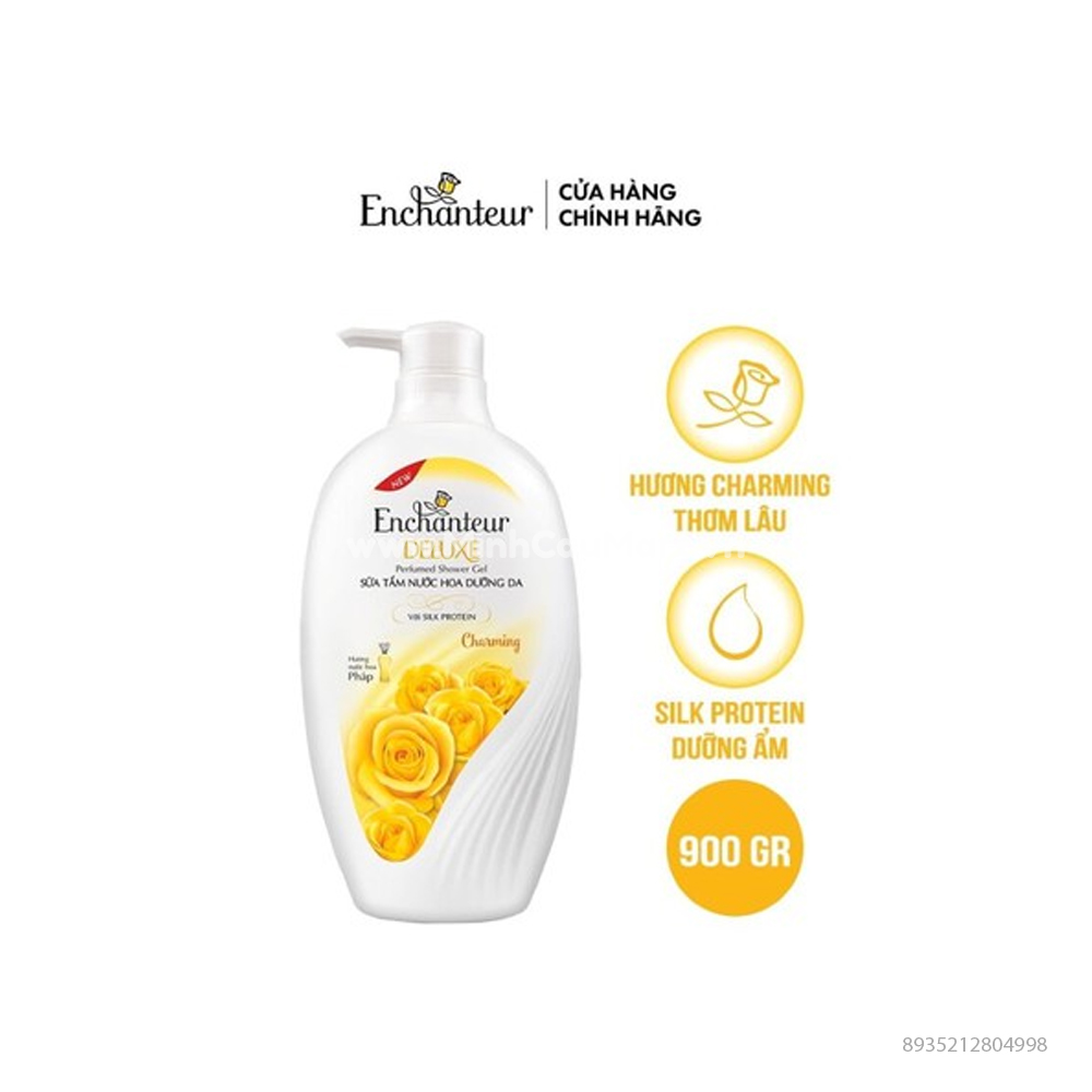 Sữa tắm Enchanteur Deluxe Charming 900g với các thành phần tự nhiên giúp cung cấp các chất dinh dưỡng cần thiết cho làn da của bạn luôn được tươi trẻ và căng tràn sức sống ,giúp da trắng sáng đồng thời bổ sung chất dưỡng ẩm cho làn da mềm mịn và tươi trẻ. Giàu dưỡng chất Silk Protein cho làn da mềm mịn như lụa.